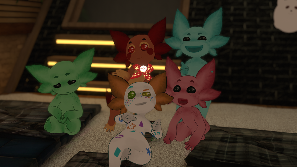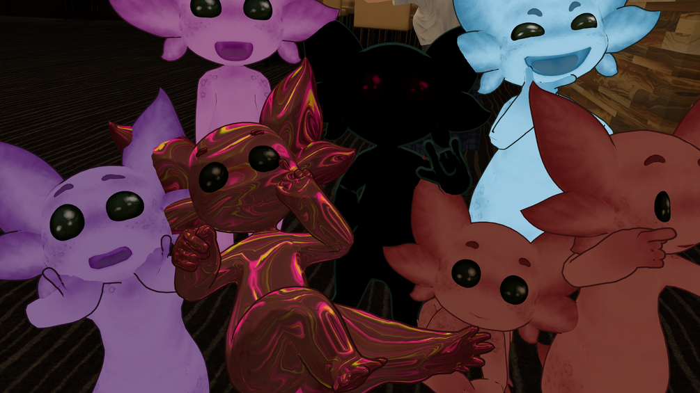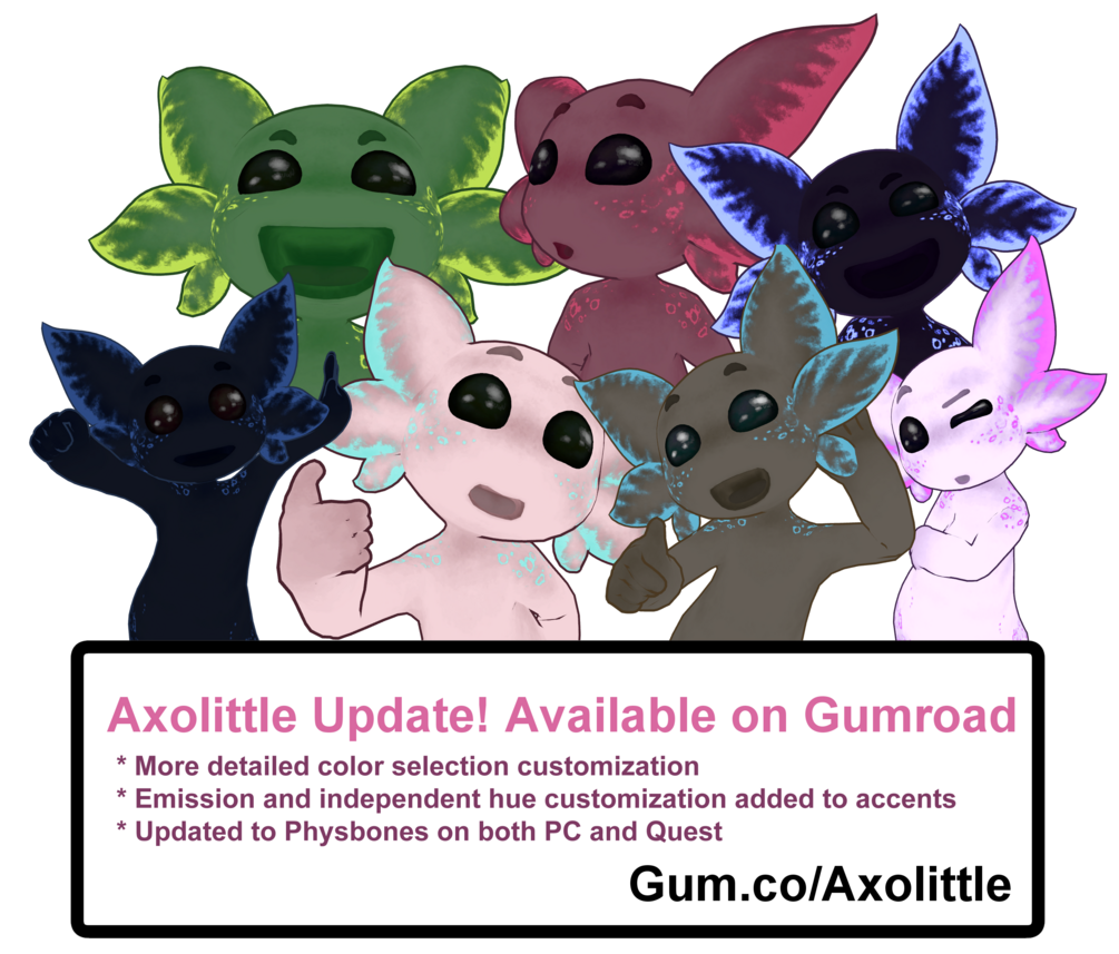 Axolittle is a Full Body axolotl 3.0 avatar created for VRChat. Highly expressive, Axolittle has over 30 custom facial expressions. To fit all of that expressiveness in one little avatar, I used Hai VR's ComboGestureExpressions tool for Unity. https://hai-vr.github.io/combo-gesture-expressions-av3/